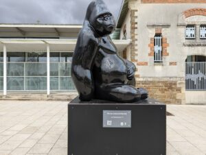 En continuant sa route vers le bourg et en arrivant à Cour et Jardin, on porte le regard sur « Le dos argenté » un gorille dont la puissance est transmise au travers des traits sculptés par l’artiste.